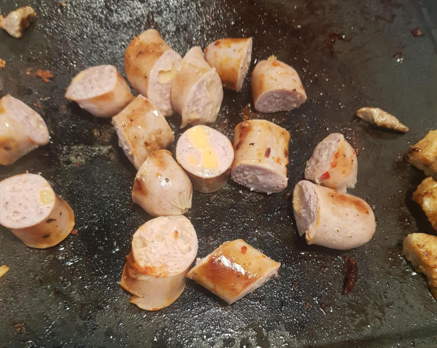 치즈소세지를 자르면 치즈가 흘러나온다! 좀 짠편이라서 안주로 최고다