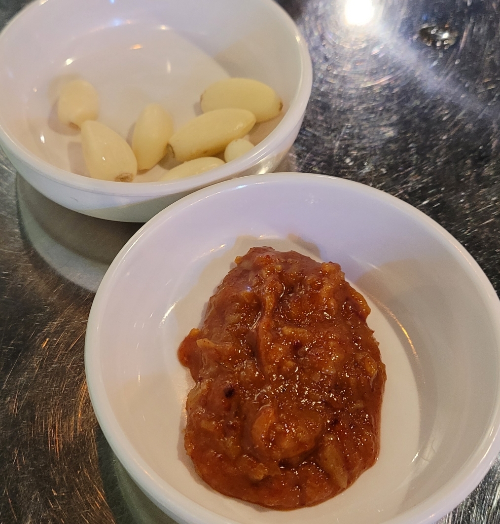 밑반찬은 깻잎, 치킨무, 생마늘, 쌈장이 나온다. 왜 하필은 치킨무일까 하고 생각해봤는데 대표 메뉴가 닭다리살이라서 그런것 같다.
