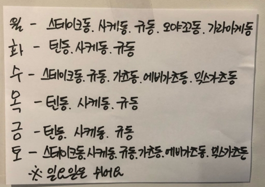 네코정은 신기하게도 요일마다 정해진 메뉴가 있다! 인스타에 있지만 여기에도 올려두겠다. 혹시 변동 사항이 있을 수도 있어서 나는 네코정 방문 하기 전에 항상 인스타를 확인 하는 편이다.