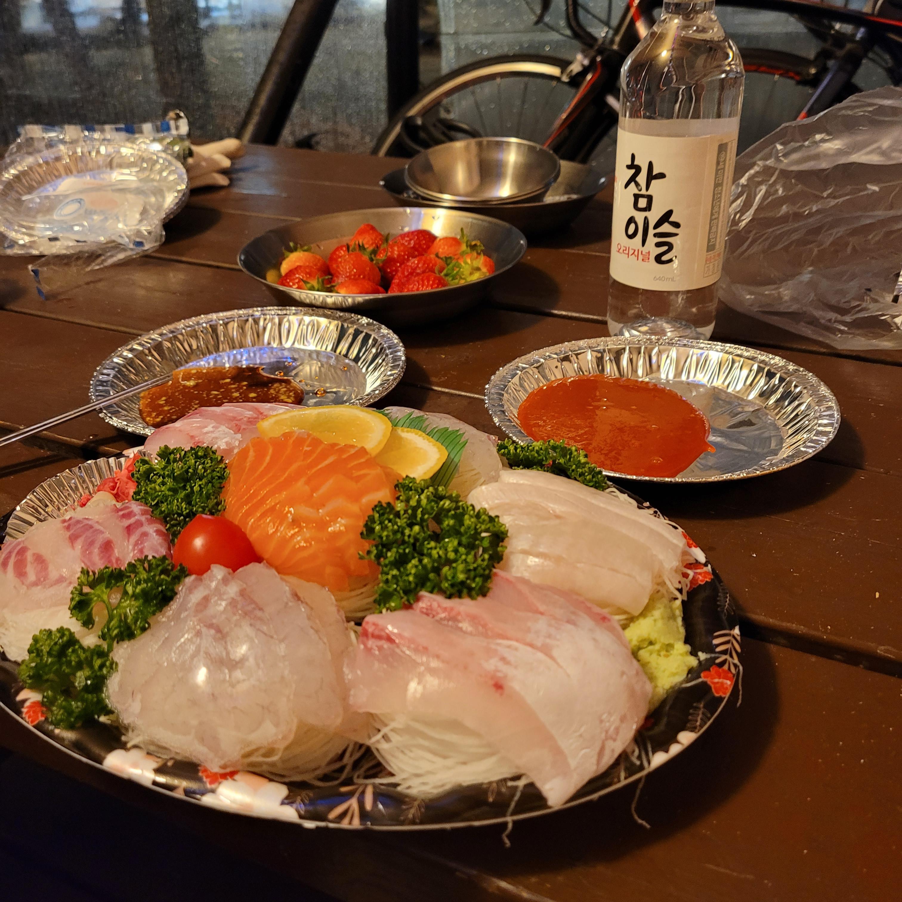 그 외에는 바베큐 재료들, 회, 딸기, 마시멜로를 샀다!