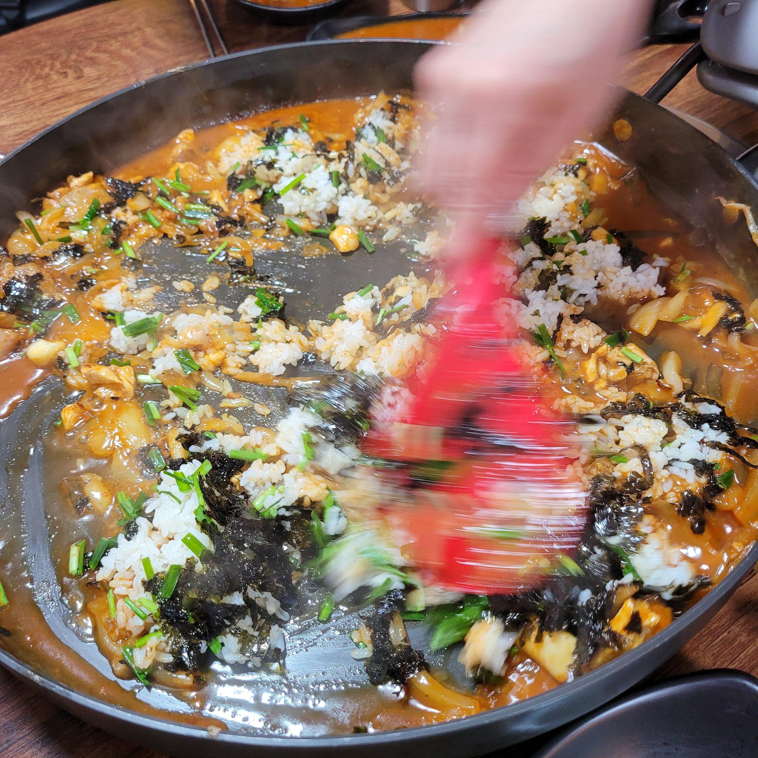 불을 최대로 키워서 국물을 졸여가는 동시에 볶음밥 재료를 넣고 볶아주신다.