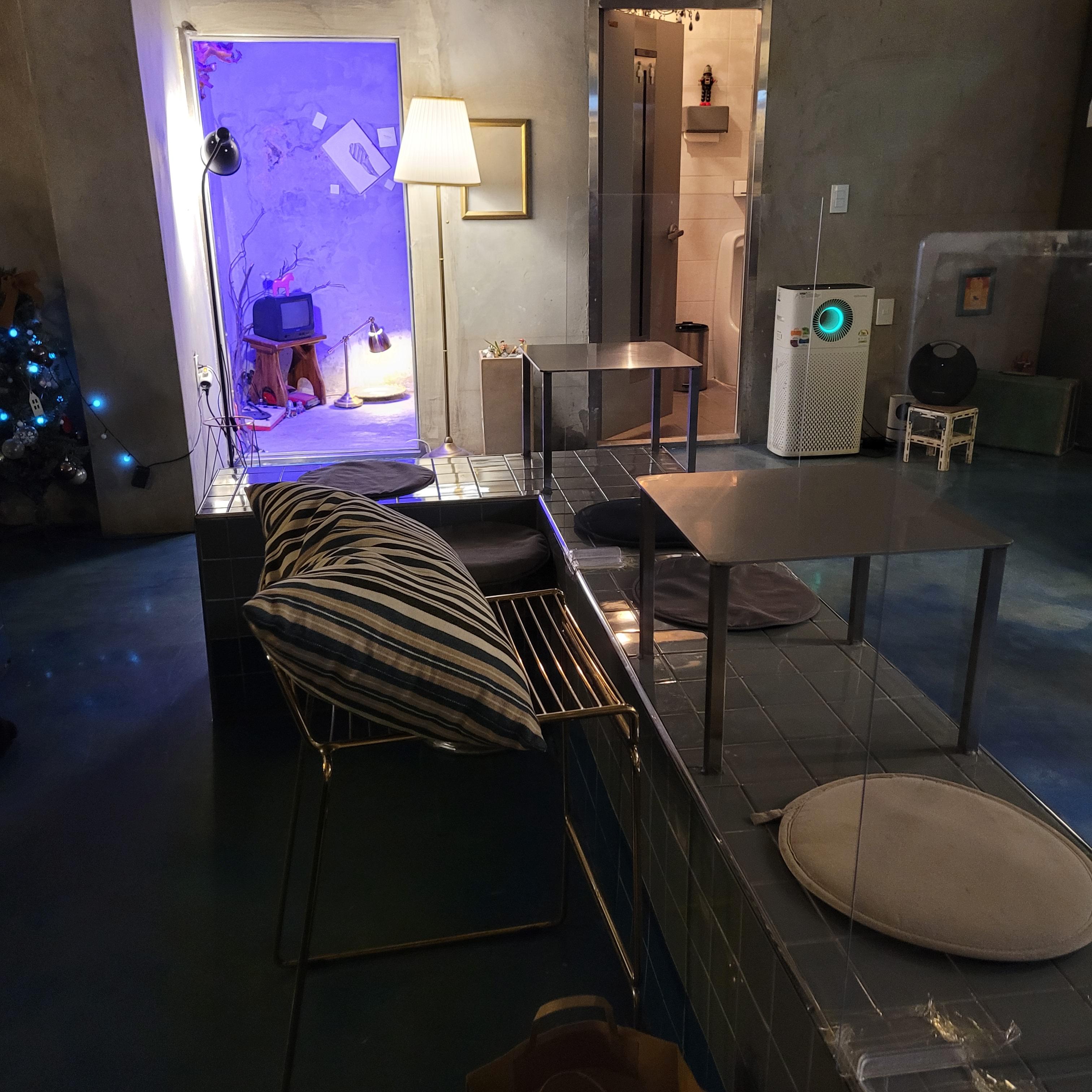통한의 2인용 테이블.... 왜 이런식으로 만들어 놓은건지... 본격 허리 부서지는 구조... 테이블도 너무 좁고 겁나 불편하다.
