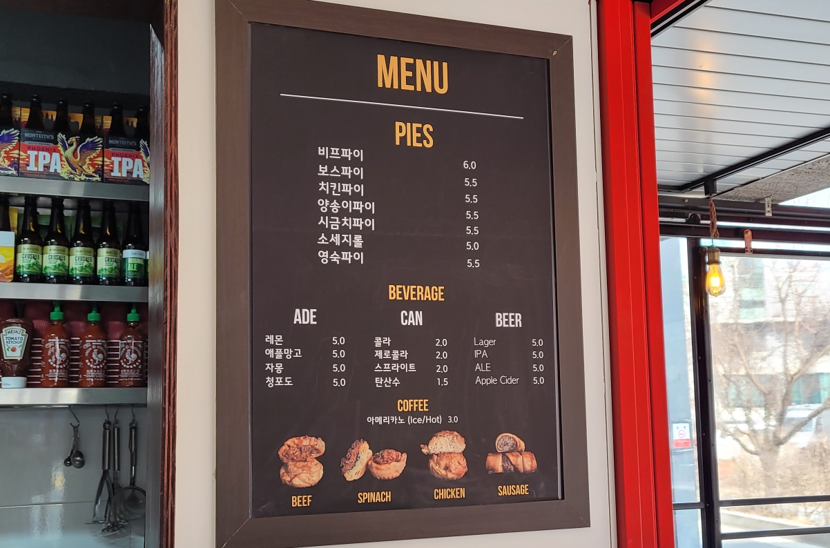 메뉴는 6가지의 파이와 소세지롤, 마실것들이 있다.