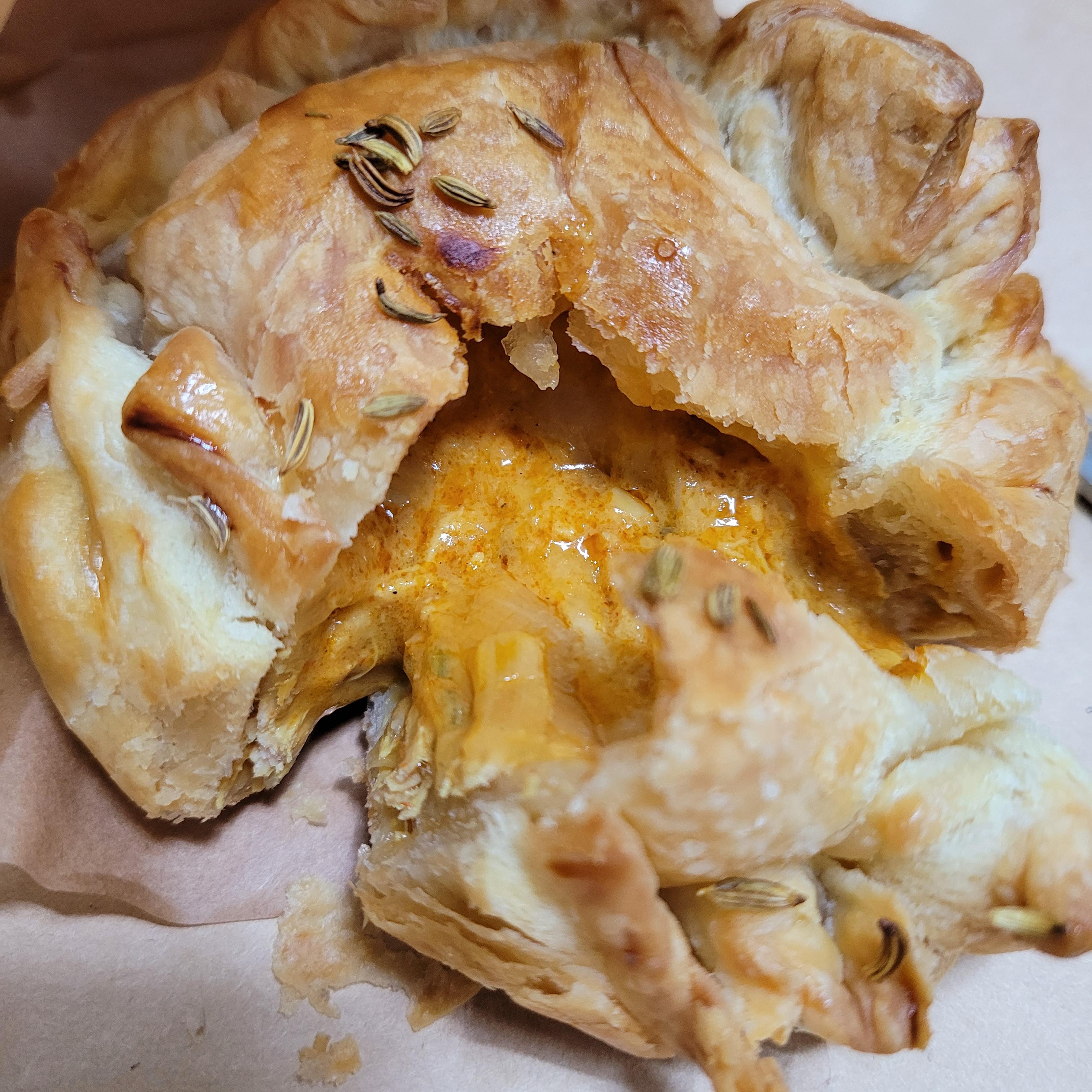 그래도 엄청 묽은 제형은 아니라서 다 조각내어 한조각씩 집어먹었다! 양송이 파이만큼 치즈가 많지는 않지만 빵 안쪽에 묻어있는 치즈와 매콤한 커리가 환상적이다..!!
