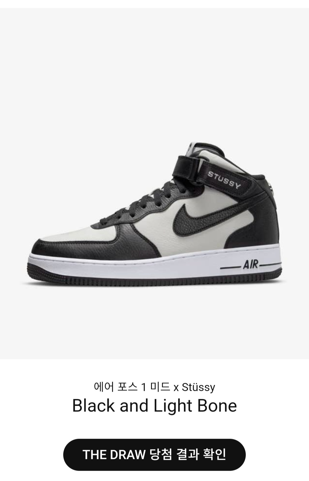 그러다가 이번에 스투시와 콜라보를 한 에어포스 1 '07 미드 (DJ7840-002)가 콜라보를 한다며 한번 응모해보라는 권유에 해보게 되었다.