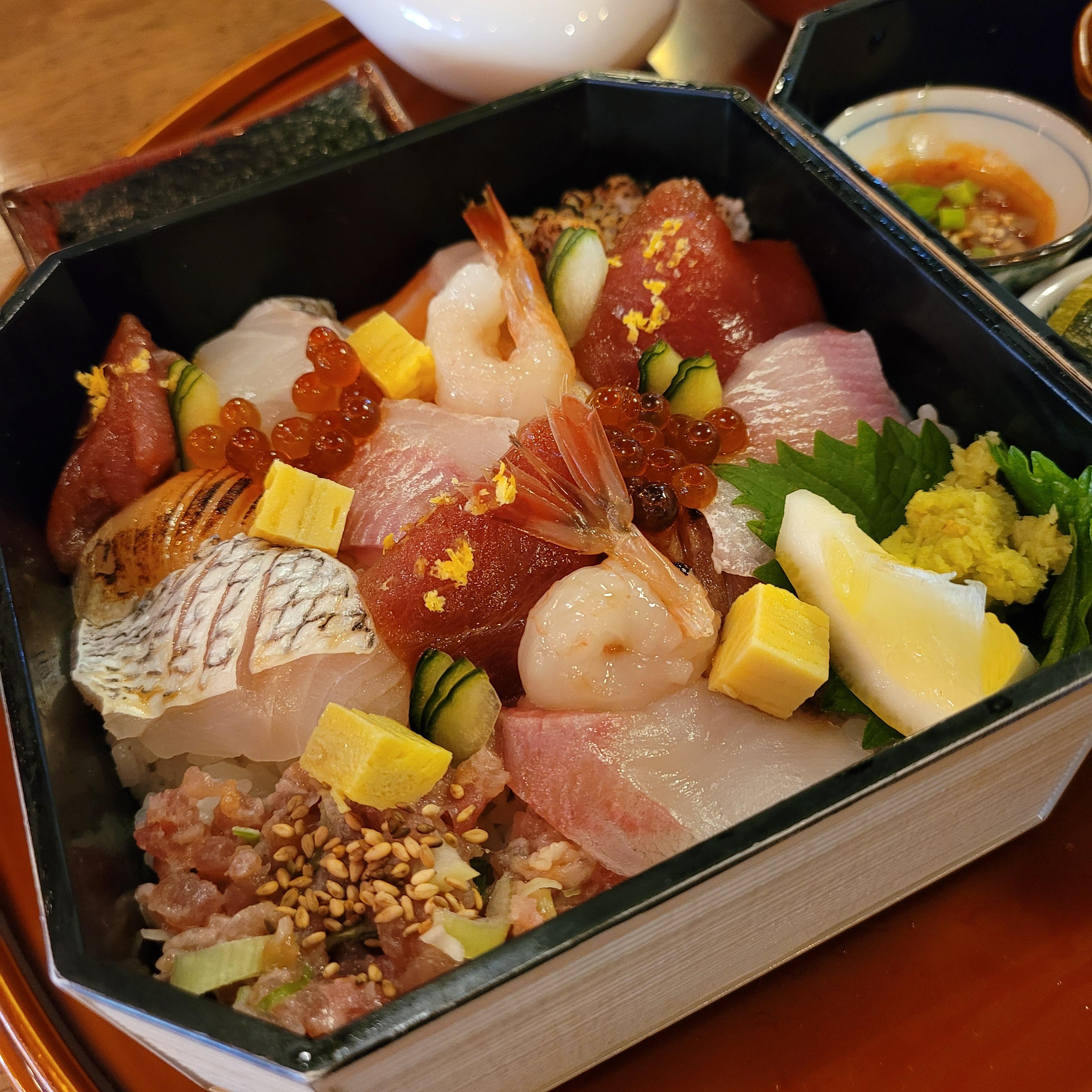 여러 종류의 회가 얹혀져있는 회덮밥이다.
