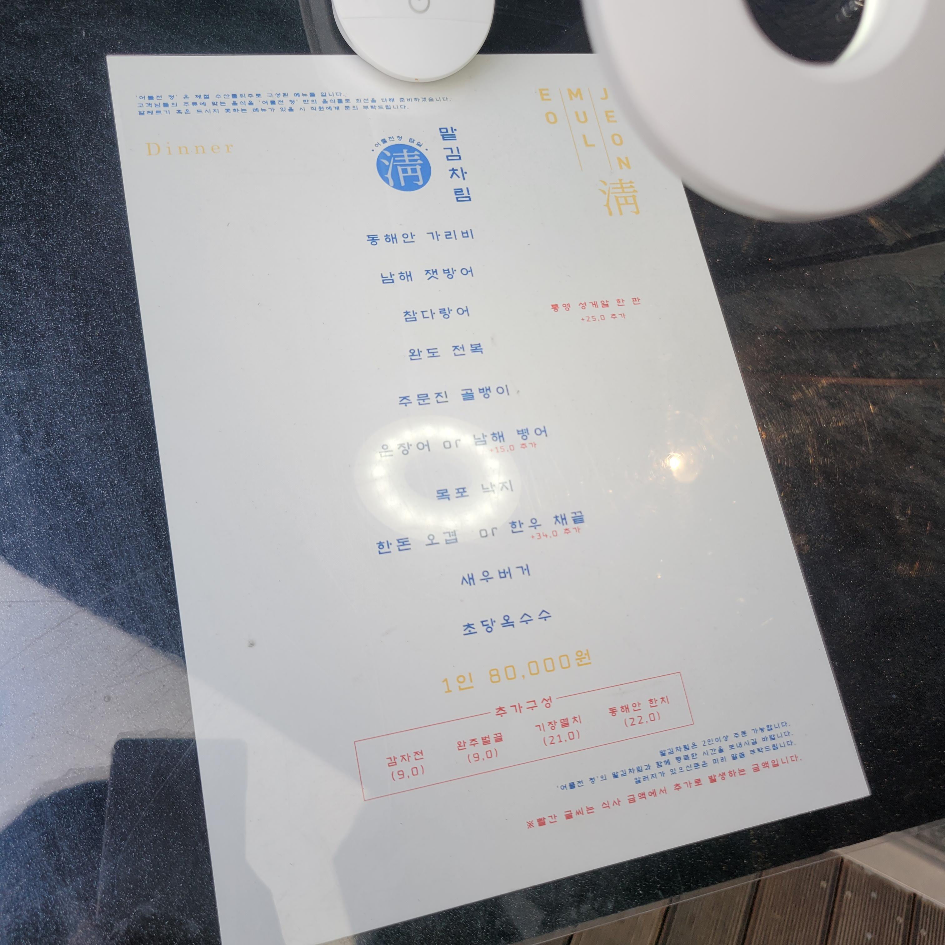 아귀간, 가리비, 제팡어와 캐비어, 참다랑어랑 블랙올리브, 전복 면요리와 내장소스, 골뱅이찜요리, 은장어구이, 낙지냉국, 채끝등심, 감자전, 초당옥수수디저트, 완주벌꿀 크로플