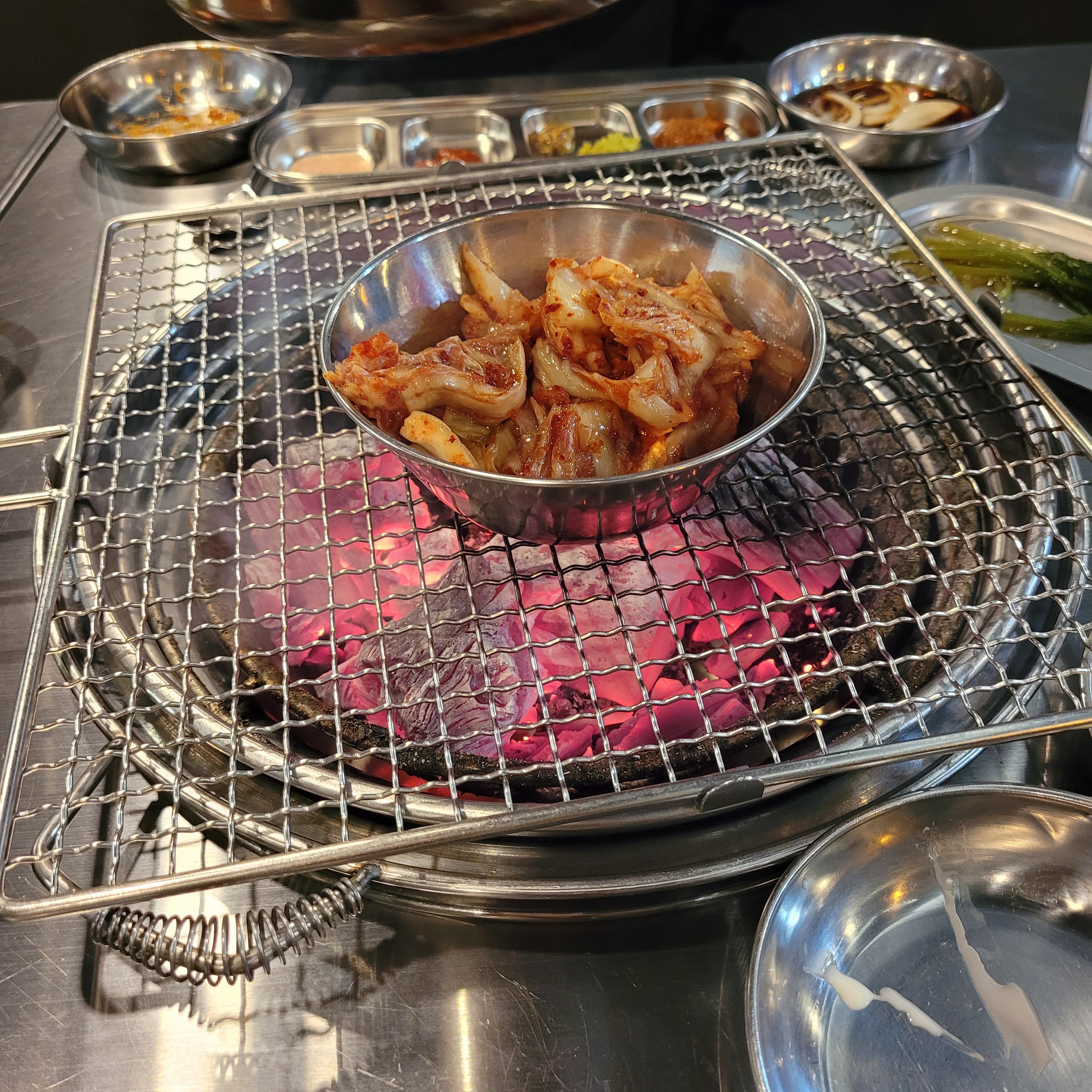 김치는 불판 한가운데 올려주셨는데 위에 있는 김치는 잘 안데워져서 자주 뒤집어줘야한다.